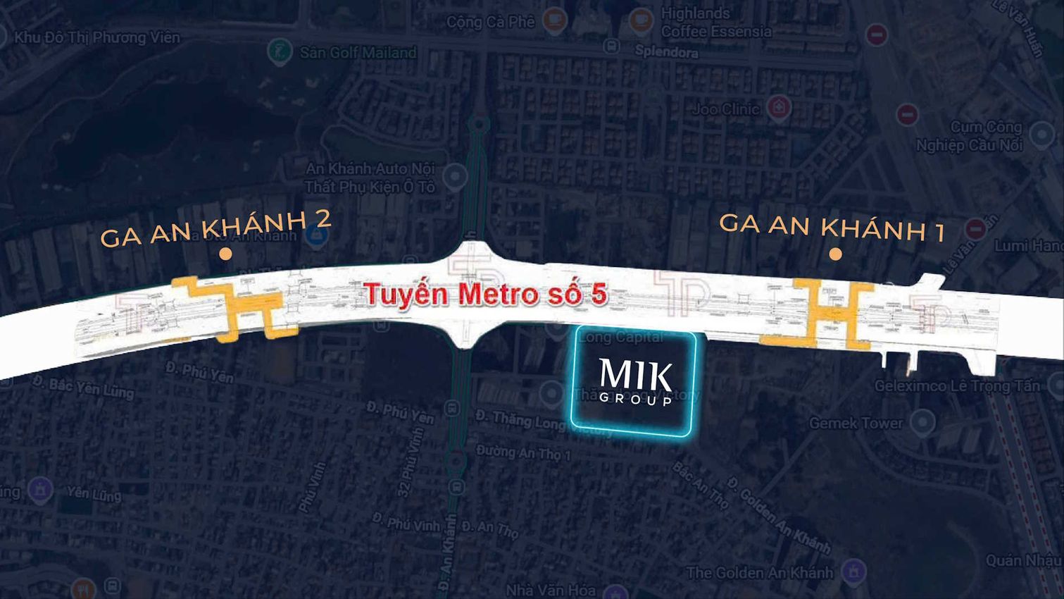 Điểm khác biệt dễ nhận thấy của MIK Nam An Khánh là vị trí bám trực tiếp mặt đường Đại lộ Thăng Long – trục hướng tâm quan trọng nhất phía Tây Hà Nội, đồng thời nằm ở khoảng giữa hai điểm ga Metro số 5 An Khánh 1 và An Khánh 2 (theo sơ đồ minh họa). Cách bố trí này giúp dự án vừa thuận tiện di chuyển bằng ô tô, vừa có lợi thế khi hệ thống metro đi vào khai thác.