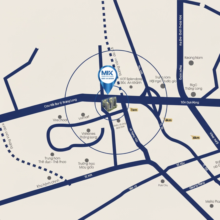 Chung cư MIK Nam An Khánh (tên thương mại: Imperia Sky Park) nằm trong khu đô thị Nam An Khánh – một trong những khu đô thị quy mô lớn và được quy hoạch bài bản nhất phía Tây Hà Nội. Vị trí này có kết nối chiến lược: